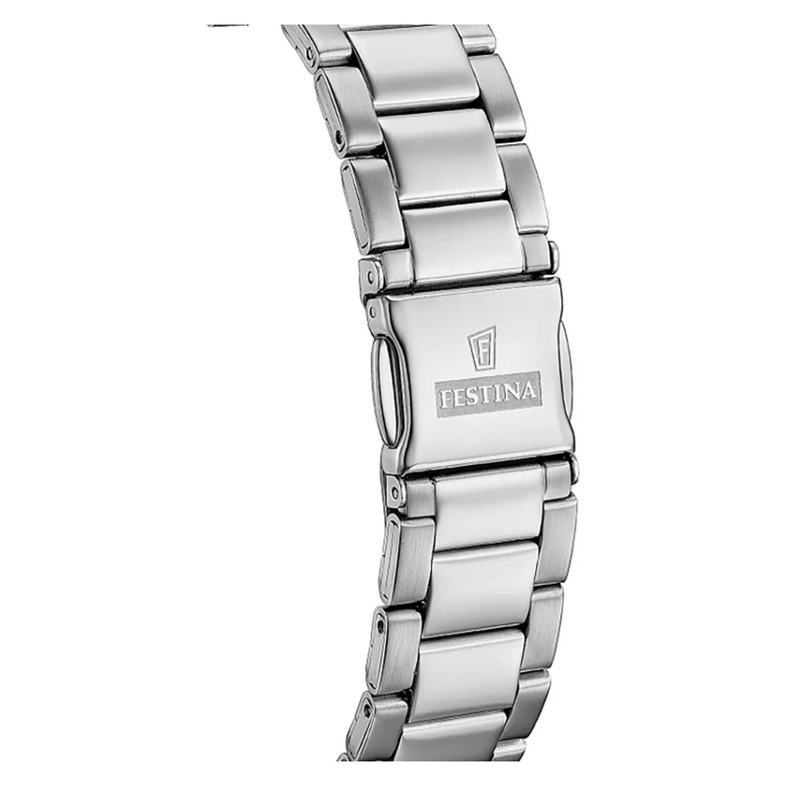 ste reloj marca Festina tiene una caja de Inox con un diámetro de 40 mm y cuenta con una correa de Inox. Dentro de la caja se encuentra un mecanismo de Miyota de alta calidad el cual esta protegido por un cristal Mineral. El reloj es resistente al agua hasta 5 ATM.